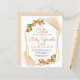 Este convite para o bebê do templo dos citros apresenta um quadro geométrico dourado adornado com laranjas aquáticas. O texto personalizável está no moderno roteiro laranja de escrita manual e sans negras serif. Personalize-o com o nome da futura mãe e os detalhes do chá. A parte traseira da placa é uma forma pastel de laranja que corresponde aos realces de aquarela na parte frontal. Ideal para um chá de fraldas de verão!