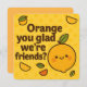 Um cartão de amizade brilhante e alegre que diz tudo: "Laranja você está feliz por sermos amigos?" Apresentando uma linda laranja sorridente sobre um fundo ensolarado, este design com tema de trocadilhos é perfeito para aniversários, notas de obrigado ou momentos justos. O dentro vazio de deixa muito espaço para sua mensagem pessoal — doce, engraçada ou uma mistura de ambos. Excelente para amigos que amam trocadilhos e um salto de cor.