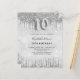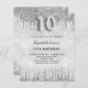 Um convite moderno, na moda e glamouroso para a 10ª festa de aniversário de uma menina. Um fundo com aparência de prata falsa, decorado com poeira brilhante. Personalize e adicione o seu nome e detalhes da festa. O número 10 é escrito com uma fonte de estilo de balão, script.