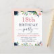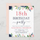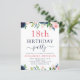 Marinho de orçamento Flores Florais Azuis e Rosa Esbranquiçadas e Convites de festas de aniversários de Água Verde 18º (18º) incluem uma bela e elegante tipografia com modernas flores cor-de-rosa azul botânica e azul Marinho para a celebração especial de 18 anos.