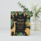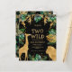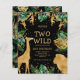 Celebrar o segundo aniversário da sua coisa selvagem com este convite temático safari da selva, que inclui folhas de ouro falsas (girafa, leão e macacos), folhagem dourada e selva verde, e uma aspersão de confete dourado. Adicione o nome do seu filho e os detalhes da festa em texto dourado sobre fundo preto. Um padrão de folhagem em verde e dourado em fundo preto decora a parte de trás da carta.