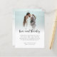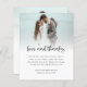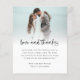 Orçamento 2 Foto Bold Script Obrigados De Amor De Casamento. Um alternativo MENOR de 4,5" x 5,6", compatível com o orçamento. Disponível em um STOCK de PLACA SEMI GLOSS 110 lb ou um STOCK de PAPEL THINNER SATIN FINISH 80 lb. O amor e os obrigados estão em um estilo manuscrito ousado. Personalize facilmente o resto do texto para seus próprios detalhes e substitua as fotos de exemplo na frente e atrás por suas próprias. Adicione seu código QR à galeria online de fotos de casamento no verso substituindo o código QR na amostra. Você pode criar códigos QR gratuitamente on-line, pesquisar 'gerador de códigos QR'.