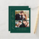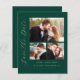 Esta simples e minimalista placa Save the Date apresenta uma colagem de 3 fotos, com uma foto horizontal no topo e duas fotos quadradas abaixo. As palavras "Salvar a Data" são executadas verticalmente para cima da margem esquerda no elegante script de escrita manual dourada. Os nomes dos casais, a data do casamento e a cidade aparecem abaixo da colagem de fotos em sans serif num fundo verde esmeralda. Adicione uma mensagem mais detalhada com informações adicionais na parte de trás, juntamente com um código QR para ajudar seus convidados a visitar o site do seu casamento.