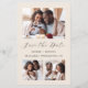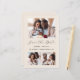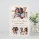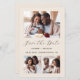 Esta simples e minimalista placa Save the Date apresenta uma fotografia horizontal na parte superior e duas fotos quadradas na parte inferior. Entre eles, as palavras "Salvar a Data" aparecem no elegante guião preto, seguido dos nomes dos casais, da data do casamento e da cidade em sans serif em um fundo bege. Adicione uma mensagem mais detalhada com informações adicionais na parte traseira, juntamente com um código QR para ajudar seus convidados a visitar o site do seu casamento.