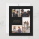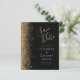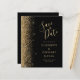 A borda esquerda deste elegante casamento moderno salve o cartão de data apresenta uma falsa borda de ouro. O texto personalizável combina manuscrito dourado, fontes em copperplate e itálico em um fundo preto. O verso fornece espaços para 4 fotos (1 quadrado, 2 horizontais, 1 vertical longo) e espaço para o seu site de casamento URL ou outras informações.