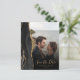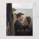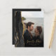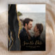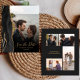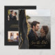 A borda esquerda deste elegante cartão moderno de "guarde a data" de casamento apresenta uma borda de ágata em aquarela preta com brilho dourado falso. A sobreposição de texto personalizável combina fontes de escrita à mão em dourado e cobre sobre uma foto de sua escolha. Um filtro gradiente preto ajuda a fazer o texto se destacar. O verso fornece espaços para quatro fotos adicionais (uma quadrada, duas horizontais e uma vertical), juntamente com espaço para o URL do seu site de casamento ou outra mensagem breve em texto dourado sobre um fundo preto. OBSERVAÇÃO: Os envelopes não estão incluídos automaticamente com esses convites econômicos, então, por favor, lembre-se de escolher a opção "envelopes brancos em branco"!