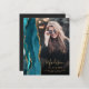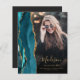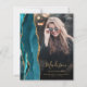 Este convite de formatura moderno de 2025 apresenta uma borda de geodo de ágata em aquarela em tons de azul-teal com destaques de brilho dourado falso. O primeiro nome do graduado aparece como uma sobreposição de texto manuscrito dourado elegante em uma foto vertical, junto com o sobrenome, escola e ano de turma em fonte copperplate. Um filtro gradiente preto ajuda o texto a se destacar. Uma segunda foto horizontal aparece no verso, junto com o anúncio e detalhes em texto dourado em um fundo escuro quase preto.