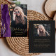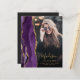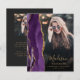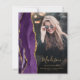 Este convite de formatura de 2026 apresenta uma borda de geodo de ágata em aquarela em tons de roxo com destaques de brilho dourado falso. O primeiro nome do graduado aparece como uma sobreposição de letra manuscrita dourada elegante em uma foto vertical, junto com o sobrenome, escola e ano de turma em fonte copperplate. Um filtro gradiente preto ajuda o texto a se destacar. Uma segunda foto horizontal aparece no verso, junto com o anúncio e detalhes em texto dourado em um fundo escuro quase preto.