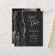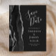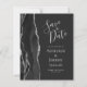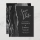 A borda esquerda deste elegante casamento moderno salve o cartão de data apresenta uma coloração d'água preta aparada com falso brilho prateado. O texto personalizável combina a escrita manual de cinzas prateadas, fontes copperplate e itálico em um fundo fora do preto. O verso apresenta um design de agata preto e prateado correspondente.