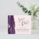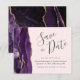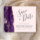 Este elegante orçamento salva a placa de data apresenta uma borda agitada de cor d'água roxa, aparada com falso brilho dourado. O texto personalizável combina o script de escrita manual de cinzas de carvão, o copperplate e as fontes itálicas em um plano de fundo cor-de-rosa pincelado. O verso apresenta um design de agate roxo e dourado correspondente.