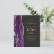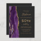 A borda esquerda deste elegante e moderno convite de aniversário 50º apresenta uma borda agitada com aquarela púrpura, aparada com brilho dourado. O texto personalizável combina manuscrito dourado, fontes em copperplate e itálico em um fundo preto de slate. Adicione instruções RSVP na parte traseira da placa, juntamente com um código QR que os convidados podem verificar para responder on-line.