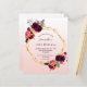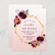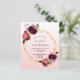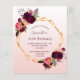 Na frente: um convite para uma festa de aniversário de 40ª (ou qualquer idade). Um rosa dourado elegante e tenente, fundo de gradiente branco com uma falso estrutura geométrica dourada. Decorados com flores roxas escuras e burgueiras, rosas e penas do estilo "boho". Modelos para um nome e detalhes da festa. O nome é escrito com um script de estilo manuscrito, letras cor roxa. Traseira: rosa dourado, fundo de gradiente branco.