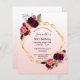 Na frente: um convite para uma festa de aniversário de 50ª (ou qualquer idade). Um rosa dourado elegante e tenente, fundo de gradiente branco com uma falso estrutura geométrica dourada. Decorados com flores roxas escuras e burgueiras, rosas e penas do estilo "boho". Modelos para um nome e detalhes da festa. O nome é escrito com um script de estilo manuscrito, letras cor roxa. Traseira: rosa dourado, fundo de gradiente branco.