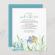 Este convite de aniversário de orçamento para gêmeos tropicais apresenta a palavra "Sob o Mar", definida em uma tipografia escrita à mão com letra na moda em azul-turquesa, com detalhes de eventos em uma cinza de carvão clássico serif em um fundo branco nítido com uma maca inferior de peixes tropicais, estrelas-do-mar, coral-do-mar e algas. A placa de convite reverte para uma cor azul complementar. Uma ideia única e bonitinha para um tema de primeiro aniversario "O Mar Sob o Mar" ou "A praia". Para ver todo esse tema da festa de aniversário de peixes tropicais por Victoria Grigaliunas, visite www.zazzle.com/dotellabelle