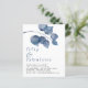 Azul Deixa 50º Convite de aniversário. Um alternativo MENOR de 4,5" x 5,6", compatível com o orçamento. Disponível em um STOCK de PLACA SEMI GLOSS 110 lb ou um STOCK de PAPEL THINNER SATIN FINISH 80 lb. Os envelopes são um extra opcional. Estilo informal. Folhas azuis de cor grande moderna decoram a parte superior e o cabeçalho é grande abaixo em na moda com os detalhes na parte inferior. Personalize facilmente o texto para seus próprios detalhes.