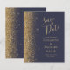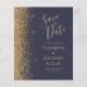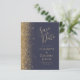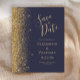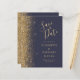 A borda esquerda deste elegante casamento moderno salve o cartão de data apresenta uma borda falsa dourada. O texto personalizável combina manuscrito pálido de cor dourada, fontes copperplate e itálico em um fundo azul escuro. O verso apresenta um design azul escuro e dourado.