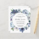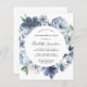 Os peões azuis empoeirados formam um quadro redondo em torno de seus detalhes de festa de aniversário neste elegante convite orçamentário.