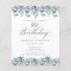 Flores azuis poeirentas criam bordas de cima e de baixo neste elegante convite de aniversário. A caligrafia clássica adiciona um belo toque. Este item é parte da coleção floral de Azul Dusty.