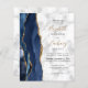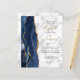 A borda esquerda deste convite de casamento moderno e elegante apresenta uma borda de água azul marinho ágata aparada com brilho dourado falso. O texto personalizável combina caligrafia dourada com fontes copperplate preta e itálica em um fundo de mármore cinza e branco. O verso fornece espaços para 4 fotos (1 quadrada, 2 horizontais, 1 vertical longa) e espaço para o URL do seu site de casamento ou outras informações.