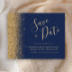 Este cartão de save the date econômico e elegante apresenta uma borda de lantejoulas douradas falsas ao longo da borda esquerda. O texto personalizável combina fontes douradas de escrita manual caprichosa, copperplate e itálico em um fundo azul marinho. O verso apresenta um design correspondente de azul marinho e lantejoulas douradas.