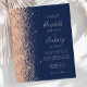 A borda esquerda deste convite de casamento moderno e elegante apresenta uma borda de falso brilho em pêssego. O texto personalizável combina caligrafia em pêssego pálido, copperplate e fontes itálicas em um fundo azul marinho. O verso apresenta um design correspondente em azul marinho e brilho em pêssego.
