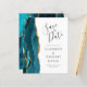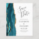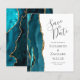 A borda esquerda deste elegante cartão de salvar a data de casamento moderno apresenta uma borda de ágata em azul turquesa com pintura à água e acabamento com glitter dourado falso. O texto personalizável combina caligrafia em cinza carvão, copperplate e fontes itálicas em um fundo branco. O verso apresenta um design correspondente em azul turquesa e ágata dourada.