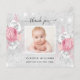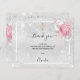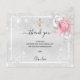 Um cartões de agradecimentos simples e elegante com foto. Um fundo metálico prateado falsa, uma estrutura branca, poeira brilhante falsa, rosas rosa, florais. Uma cruz ouro. Personalize e adicione uma nota de agradecimento, foto das meninas e nome. Texto preto.