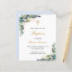Um fundo branco decorado com verde de eucalipto e folhas de ouro e ouro. Personalize e o nome e os detalhes da cerimônia. Letras pretas e ouros coloridas. Verso: cor azul clara do fundo.