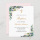 Um fundo branco decorado com verde de eucalipto e folhas de ouro e ouro. Personalize e o nome e os detalhes da cerimônia. Letras pretas e ouros coloridas. Traseira: cor de fundo cor-de-rosa pincelada.