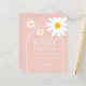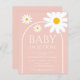 Você está planejando um chá de fraldas de menina? Este encantador convite orçamental é decorado com margaridas desenhadas à mão num fundo de arco rosa. Diz "Baby in Bloom" na tipografia da na moda. Facilmente personalizável. Desenho original © Michele Davies.
