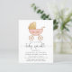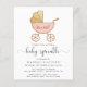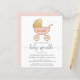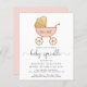 Este convite de sprinkle para menina, acessível e fofo, apresenta uma aquarela em tons pastel rosa e dourado de um carrinho de bebê retrô. Você pode personalizar o texto no carrinho ou deixá-lo em branco. "baby shower" está escrito em uma fonte estilosa com floreios.