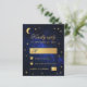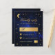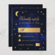 Um RSVP de Casamento de Orçamento para um tema de casamento celestial, com a lua e a estrela num fundo azul-noturno estrelado. As palavras "gentilmente respondem" e a letra M são escritas num guião caligráfico elegante. A lua e os lugares a preencher são folhas falsas de ouro, os lugares para aceitar e declinar são estrelas falsas de ouro. No preto, há apenas a lua e a estrela num fundo azul-noturno estrelado. A foto noturna estrelada é de Felix Mittermeier, de Pixabay, e está livre para uso comercial.