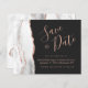 Este elegante orçamento salva a placa de data apresenta uma cor d'água branca e cinza e borda agitada com falso brilho rosa. O texto personalizável combina um script de escrita manual de cor rosa, fontes copperplate e itálico num fundo preto de ardósia. O lado inverso apresenta um design agate correspondente.