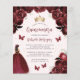 Este adorável convite da quinceañera mostra uma borda de flores de aquarela burgundy em um fundo de burgundy pálido. Uma tiara dourada, uma menina de cabelo escuro em um vestido de princesa burlu e pequenas borboletas burguesas decoram o texto. A palavra "Quinceañera" e o nome do convidado de honra aparecem num elegante guião de escrita manual burgundy, com o texto remanescente na fonte serif cinza.