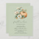 Este doce convite para chás de fraldas apresenta uma imagem aquosa de duas abóboras em tons pastéis de verde-sábio e laranja, enfeitados com flores brancas e laranja, sobre um fundo verde-sábio. Abaixo, as palavras "apaixonar-se" aparecem no elegante roteiro de cinza de carvão. Personalize o texto com o nome da futura mãe no script e os detalhes na fonte serif de cinzas de carvão. Ideal para um chá de fraldas de queda neutro em termos de gênero.