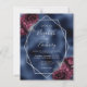 Este convite de casamento moderno e elegante apresenta uma moldura geométrica prateada decorada com buquês florais burgundy e prata em um fundo de falso foil azul marinho. O texto personalizável combina escrita à mão caprichosa prateada, fontes copperplate e itálicas. O verso fornece espaço para detalhes do casamento, juntamente com um código QR que os convidados podem escanear para visitar seu site e responder.