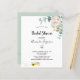 Um convite para uma noiva. Um fundo branco chique. Decorado com flores brancas pintadas à aguarela (peônia) folhagens de eucalipto, folhas e raminhos, e uma abelha feliz sorridente carregando um envelope. Personalize e adicione um nome e detalhes da festa. Letras pretas. O texto: Chá de Noiva e o nome da futura noiva são escritos com um estilo de letra manuscrita moderno.