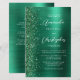 A borda esquerda deste elegante convite de casamento moderno apresenta uma borda de brilho falso esmeralda. O texto personalizável combina fontes de letra manuscrita branca e sem serifa em um fundo verde de metal polido falso. O verso fornece espaço para detalhes do casamento em um fundo de metal polido esmeralda, juntamente com um código QR que os convidados podem digitalizar para visitar seu site e responder, o que economiza o custo de impressão e envio de cartões de RSVP separados.