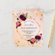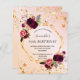 Na frente: Um convite para uma festa de aniversário de 50 anos, 50 (ou qualquer idade). Um rosa dourado, fundo branco cor-de-rosa cor-de-rosa com uma falso estrutura geométrica dourada. Decorados com flores roxas escuras e burgueiras, rosas e penas do estilo "boho". Estrelas douradas falsas pingando. Personalize e adicione um nome e detalhes da parte. O nome é escrito com um script de estilo manuscrito, letras pretas. Traseira: Rosa dourado, verde-claro-gradiente cor-de-rosa e estrelas ouro.