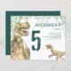 Convite de aniversário de cinco anos do T-Rex rugindo e do dinossauro velocirraptor com folhagem da selva e tipografia moderna verde. Fãs de dinossauros, especialmente meninos, vão adorar este convite de aniversário de 5 anos com tema pré-histórico marrom e verde. Fácil de personalizar com o nome do menino ou menina que faz aniversário, o número do aniversário e os detalhes da festa. Você está preparado para um aniversário de dinossauro cheio de diversão com tema de selva de dinossauros. Todas as espécies de dinossauros são bem-vindas. Ilustrações de dinossauros da era jurássica pré-histórica, arte original da artista Catherine Sweetman.
