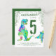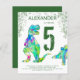 Celebre o menino que ama dinossauros ao completar 5 anos com este convite de festa de aniversário de T-Rex colorido rugindo e de estegossauro fofo convidando os fãs de dinossauros para uma festa de 5º aniversário. Personalize este convite de selva jurássica com Tiranossauro e estegossauro psicodélicos coloridos adicionando o nome do menino ou menina que está fazendo aniversário, o número do aniversário e os detalhes da festa e você estará pronto para uma festa de aniversário de dinossauros verde cheia de diversão. Todas as espécies de dinossauros são bem-vindas. Ilustrações de dinossauros da era jurássica pré-histórica, arte original da artista Catherine Sweetman.