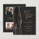 A borda esquerda deste elegante casamento moderno salve o cartão de data apresenta uma borda de agata preta aparada com falso brilho dourado. O texto personalizável combina manuscrito dourado, fontes em copperplate e itálico em um fundo fora de preto. O verso fornece espaços para 4 fotos (1 quadrado, 2 horizontais, 1 vertical longo) e espaço para o seu site de casamento URL ou outras informações.