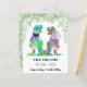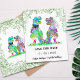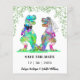 Delicie seus convidados com este engraçado casamento com tema de dinossauro T Rex noiva e noivo com folhagem da floresta para salvar a data. Fácil de personalizar com os nomes dos noivos e a data do casamento. Ilustrações coloridas de T Rex noiva e noivo em aquarela com tipografia moderna. Arte original única da artista Catherine Sweetman