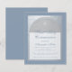Um convite moderno de primeira comunhão. Num fundo retangular azul-escuro, há um arco falso de folha de prata que contém texto azul-escuro sobre um fundo branco. A ocasião e o nome são escritos numa fonte caligráfica elegante; a primeira linha é um texto arqueado.