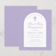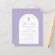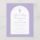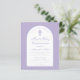 Um convite de primeira comunhão moderno. Em um fundo lavanda (roxo claro), tem um arco branco com texto lavanda dentro. A ocasião e o nome são escritos em uma fonte caligráfica elegante; a primeira linha é um texto arqueado.