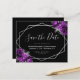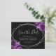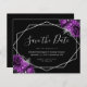 Este cartão de salvar a data de casamento econômico e elegante apresenta uma moldura geométrica prateada decorada com flores roxas e prateadas em um fundo preto. O texto personalizável combina caligrafia caprichosa cinza prateada, copperplate e fontes itálicas.