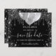Uma moça e moda Salvem a data para uma doce festa de aniversário 16, 16. Um fundo preto decorado com pingos falso de luz prateada, faíscas e balões. Personalize e adicione uma data e nome/idade. O texto: Salvar a Data é gravado com um script de estilo com letra de tendência grande.