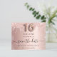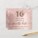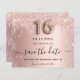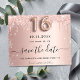 Uma garota e moda Salve o cartão de data para uma doce festa de aniversário 16, 16. Rosa dourado esmaecido fundo metálico decorado com ouro rosa, dourado e cinzas vítreas e poeira. Personalize e adicione uma data e um nome/texto. O texto: Salvar a Data é gravado com um script de estilo com letra de tendência grande com alternâncias. Número 16 com uma fonte no estilo do balão.