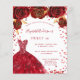 Um convite moderno, na moda e glamouroso para uma doce festa de aniversário 16, 16. Um fundo branco com brilhos, um vestido vermelho e rosas vermelhas, florais. O nome é escrito com um moderno estilo escrito à mão. Personalize e adicione os detalhes da sua festa.