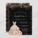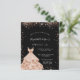 Um convite moderno, na moda e glamouroso para uma doce festa de aniversário 16, 16. Um fundo preto chic com rosa dourado falso brilho e um vestido. O nome é escrito com um moderno estilo escrito à mão. Personalize e adicione os detalhes da sua festa.